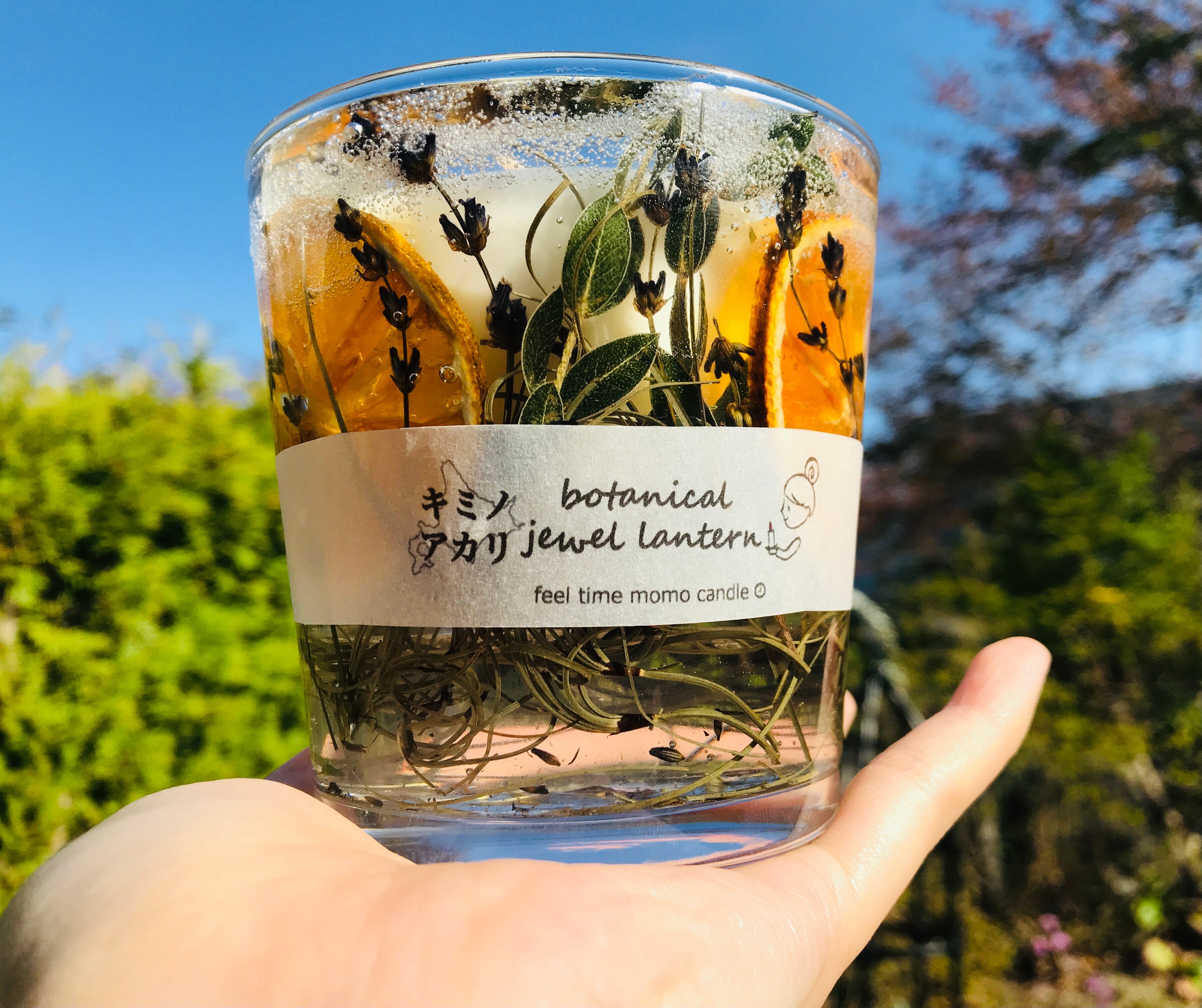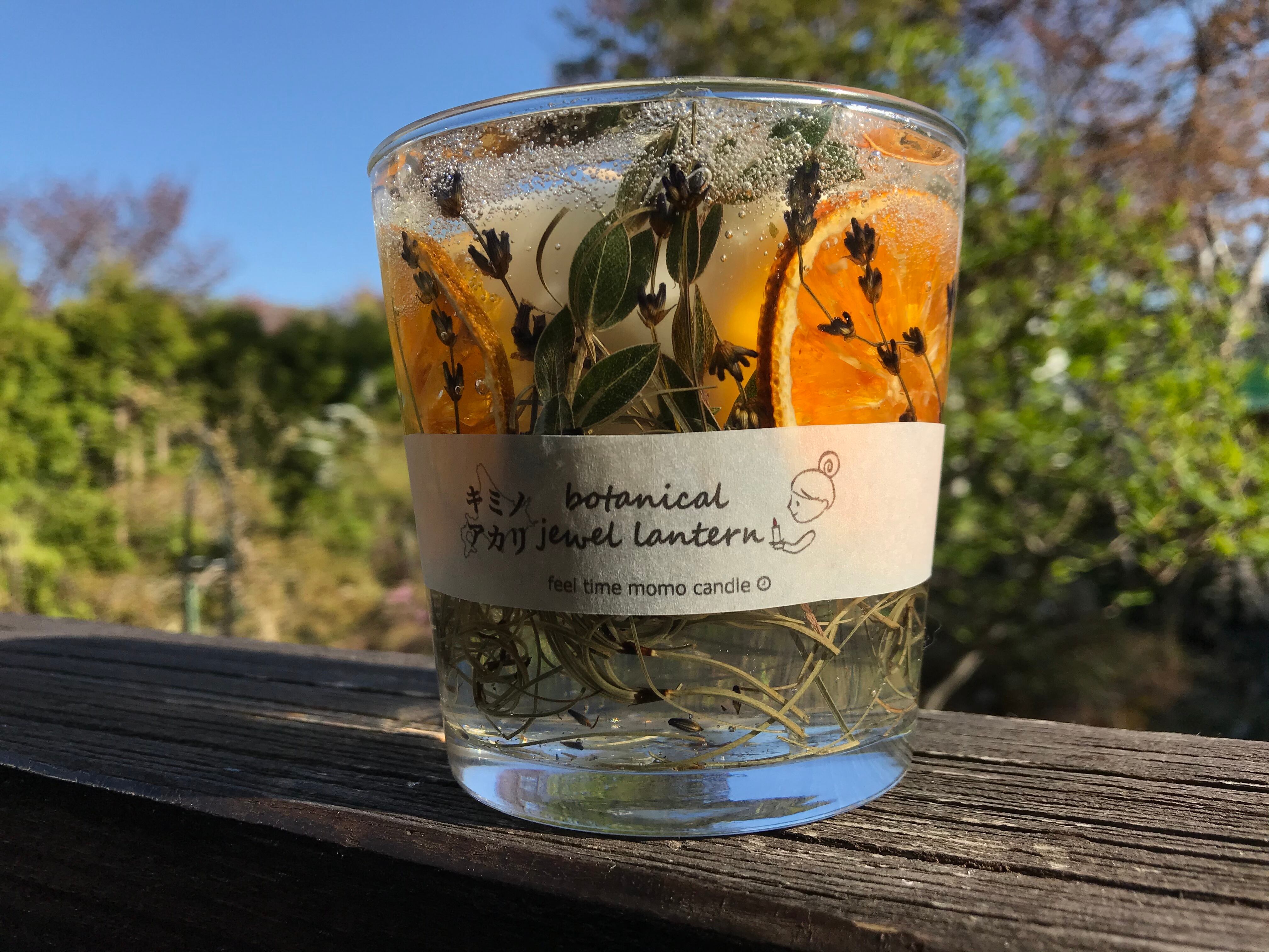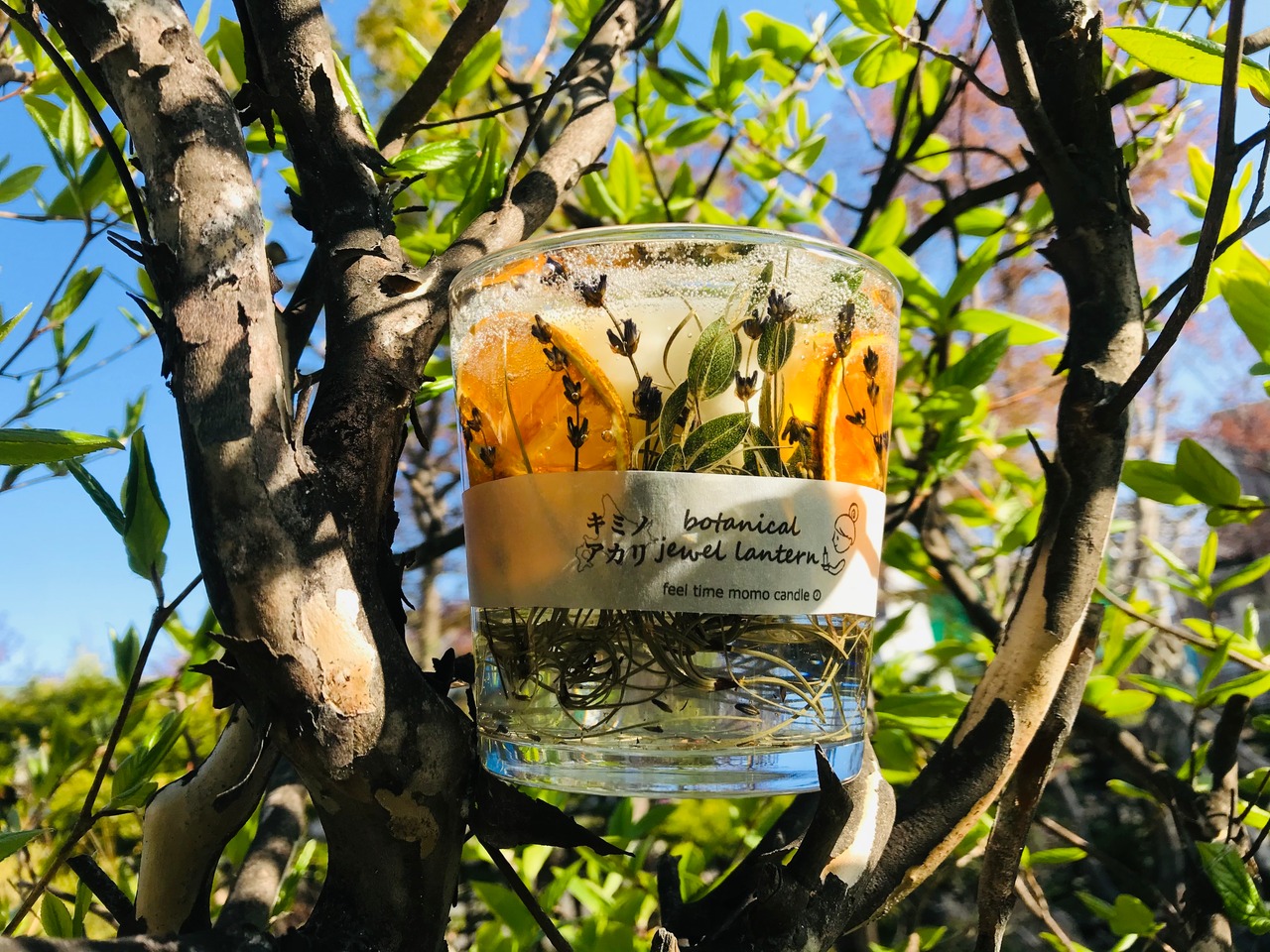 オレンジや、ラベンダー、ユーカリをあしらったボタニカルキャンドルです。見た目も爽やかでジューシーな仕上がりになっております。食卓の灯りにも似合うキャンドルです。