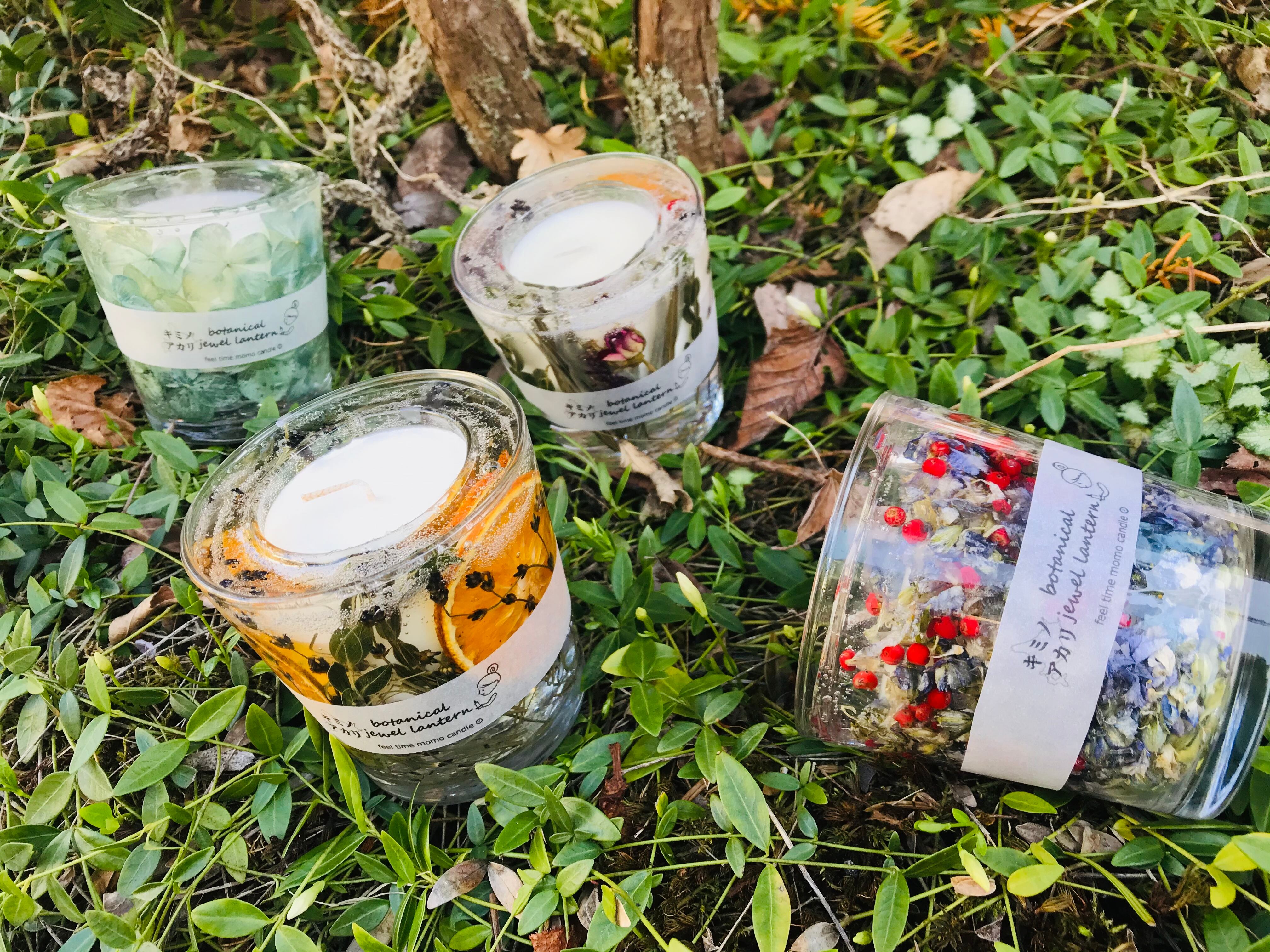 ジュエルランタンは、火を灯し進めていく過程で、徐々にドライフラワーが内側からライトアップされてとても美しいキャンドルです。